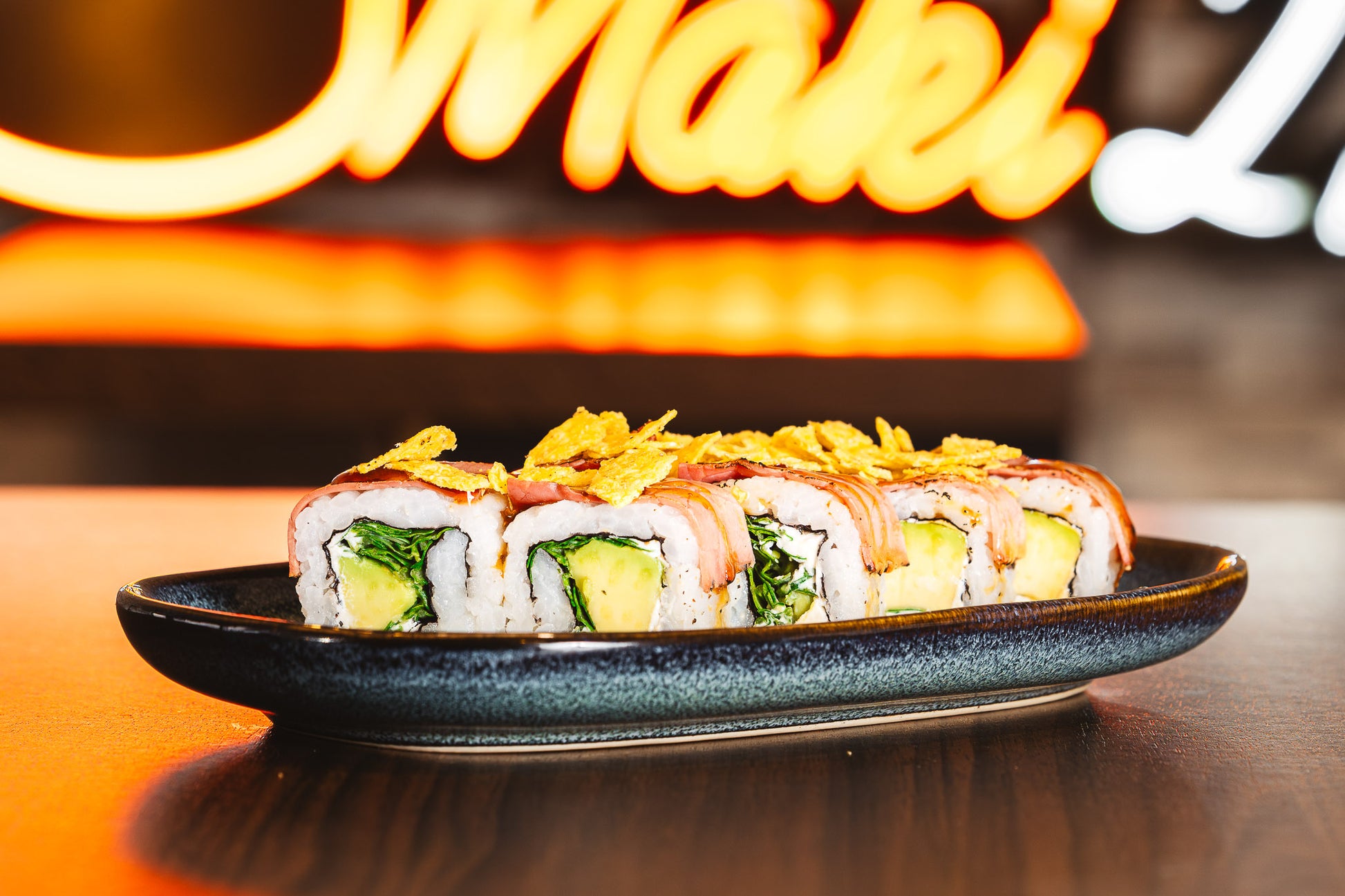 Fromage, avocat, roquette, carpaccio de bœuf grillée, sauce unagi ,Sauce mayonnaise légèrement épicé, oignons frits