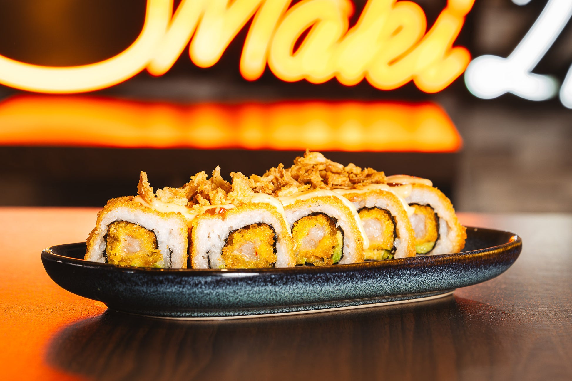 Tempura crevette, avocat, panure, aigre-douce, mayonnaise légèrement épicé, oignons frits. Attention : sushi chaud !