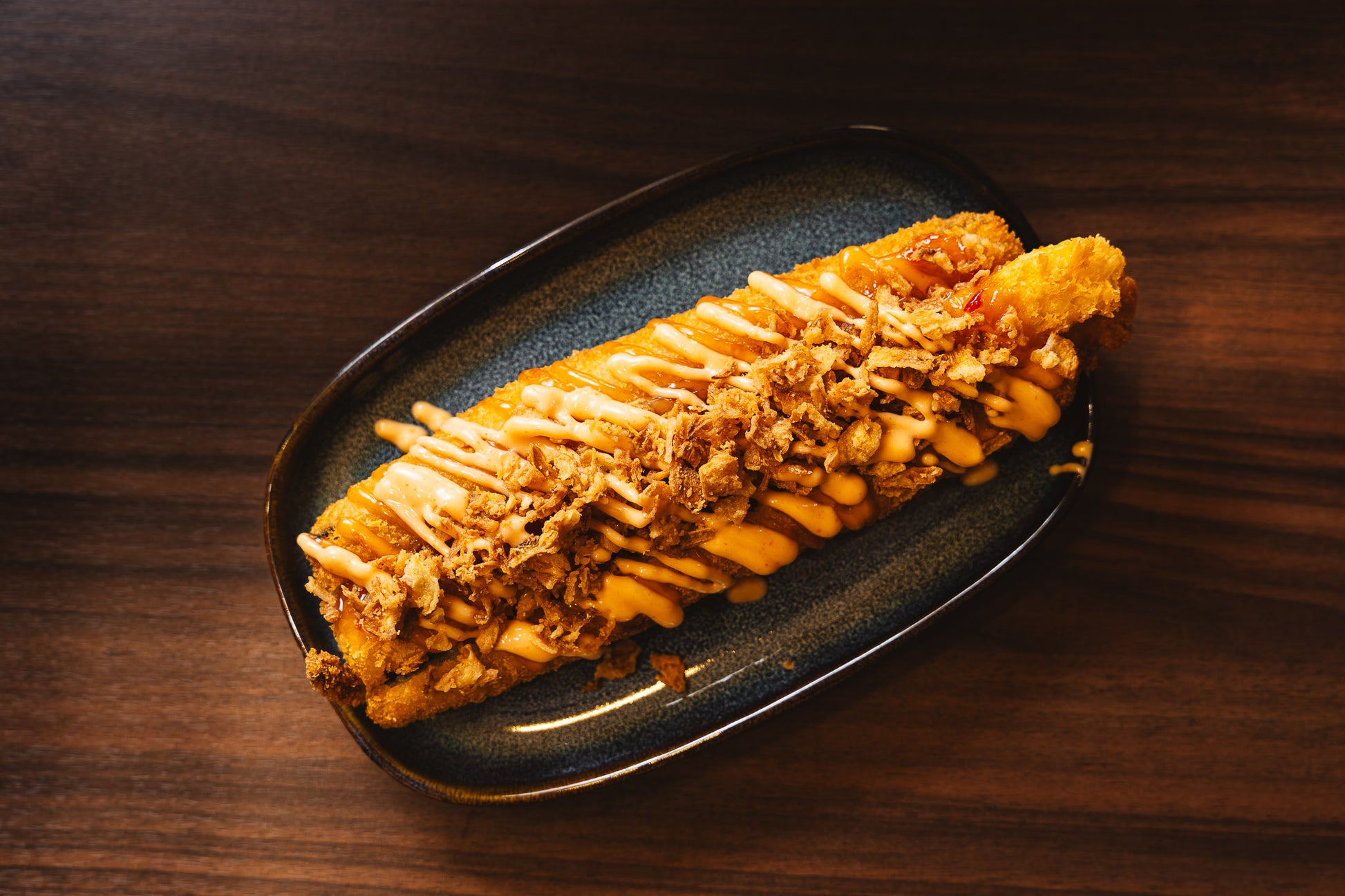Un sushi façon sandwich chaud. Garnie avec du surimi, tempura crevette, aigre-douce, sauce mayonnaise légèrement épicé, oignon frit.